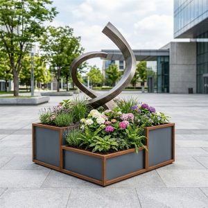 Landscape products combining FRP and steel structure for public space decoration, custom production in around 30 days, and painted finishing for outdoor visual impact.